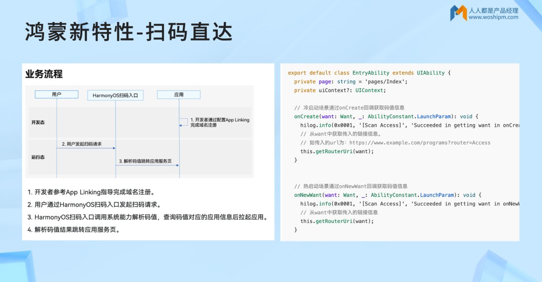 实现流程:开发者参考App Linking指导完成域名注册→用户通过鸿蒙扫码入口发起请求→系统解析码值并查询对应应用→拉起应用并跳转至目标服务页。
