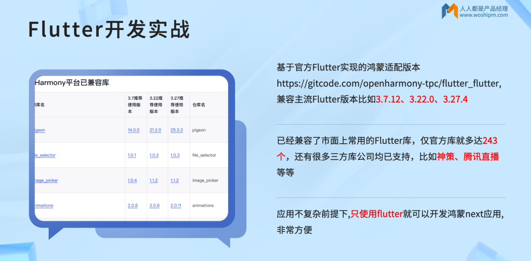 鸿蒙已基于官方Flutter实现适配版本,兼容主流Flutter版本(如3.7.12、3.22.0、3.27.4),且支持243个官方Flutter库及神策、腾讯直播等三方库,应用不复杂的前提下,仅使用Flutter即可开发鸿蒙Next应用。