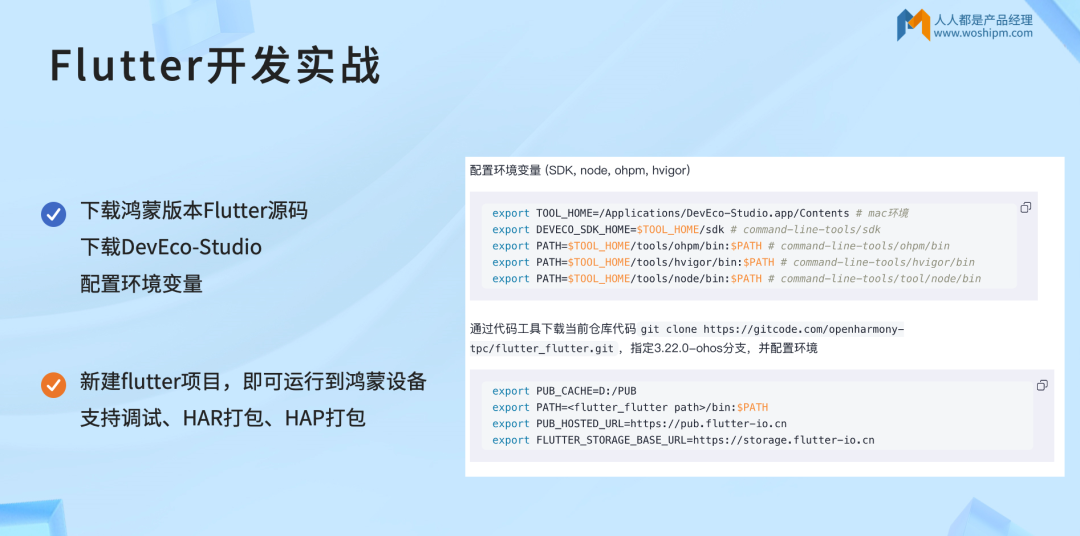 下载鸿蒙版本Flutter源码、DevEco Studio工具,配置SDK、node、ohpm、hvigor等环境变量(以Mac环境为例,需设置TOOL_HOME、DEVECO_SDK_HOME等路径);