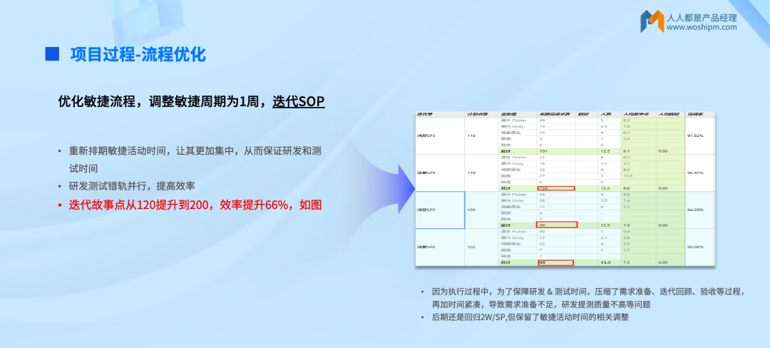 - 迭代周期调整:初期采用两周一个迭代的节奏,后尝试改为一周一个迭代,效率提升66%,但因压缩了需求准备、迭代回顾及验收时间,为保障质量最终回归两周一个迭代的合理节奏;