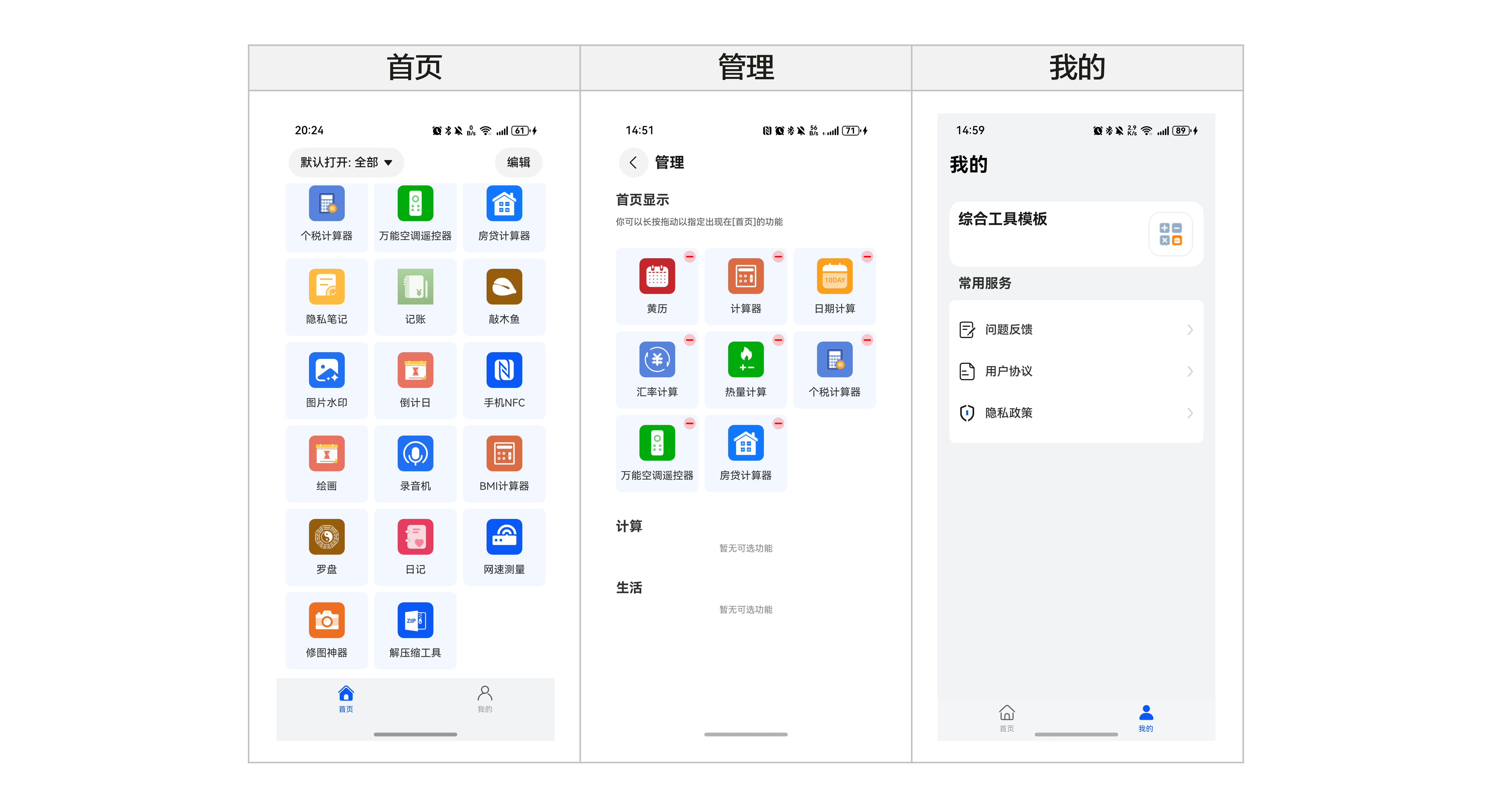 本模板为综合工具类应用提供了常用功能的开发样例,主要分首页、我的两大模块,模板提供各功能模块拆分为黄历、计算器、敲木鱼等组件单独使用。