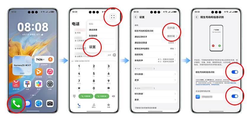 打开“电话”> 点击右上角“更多”图标 > 前往“设置”> 找到“陌生号码和信息识别” > 打开对应企业应用的号码识别功能开关