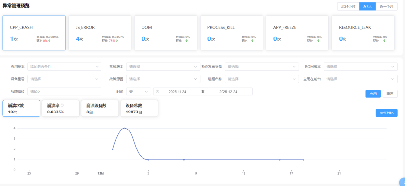 - 查看核心数据:默认展示异常指标(崩溃、无响应发生率)与性能全景图,支持自定义时间范围、设备型号、应用版本等筛选条件,数据实时更新,问题直观可见。