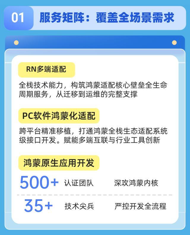 ● 鸿蒙原生应用定制开发:依托鸿蒙方舟编译器、分布式数据管理等核心技术,打造贴合企业业务场景的原生应用。兼顾运行效率与系统兼容性,从根源上规避非原生应用常见的卡顿、闪退、权限冲突等问题,适配政务、企业管理、终端服务等多类场景需求。