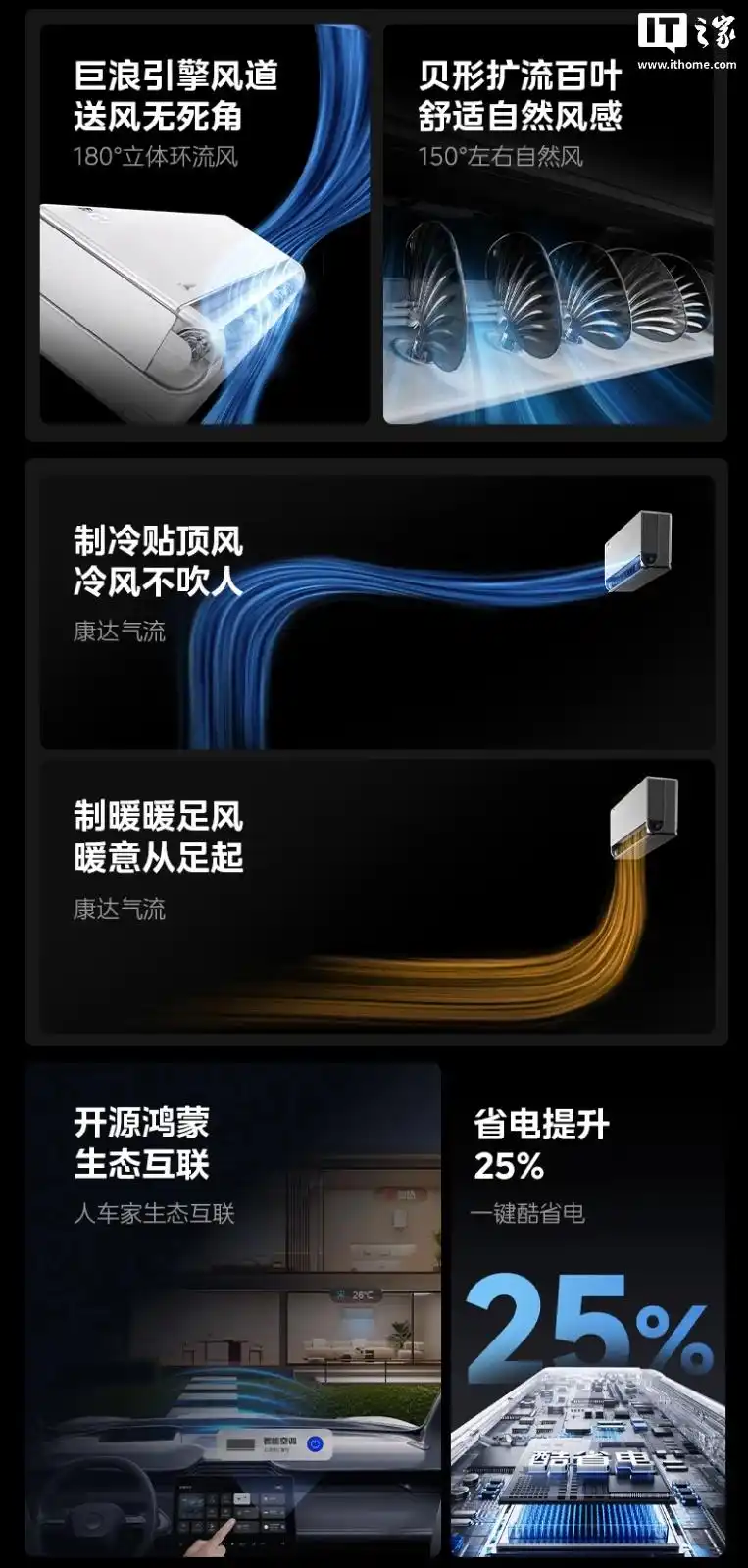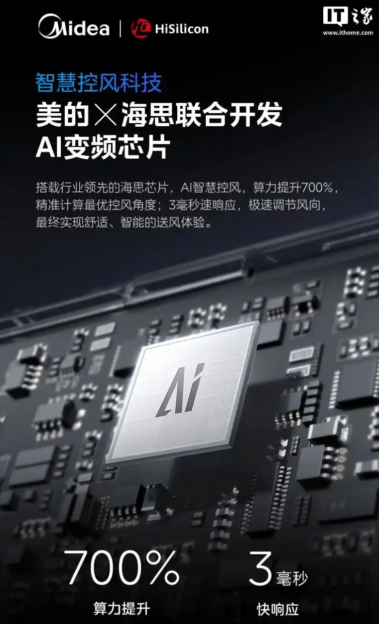 美的空界 M5 空调还支持开源鸿蒙生态互联,接入人车家生态,支持车机语音、中控屏联动等;搭载海思 AI 变频芯片,支持 AI 智慧控风,宣称算力提升 700%,支持 3 毫秒快响应。