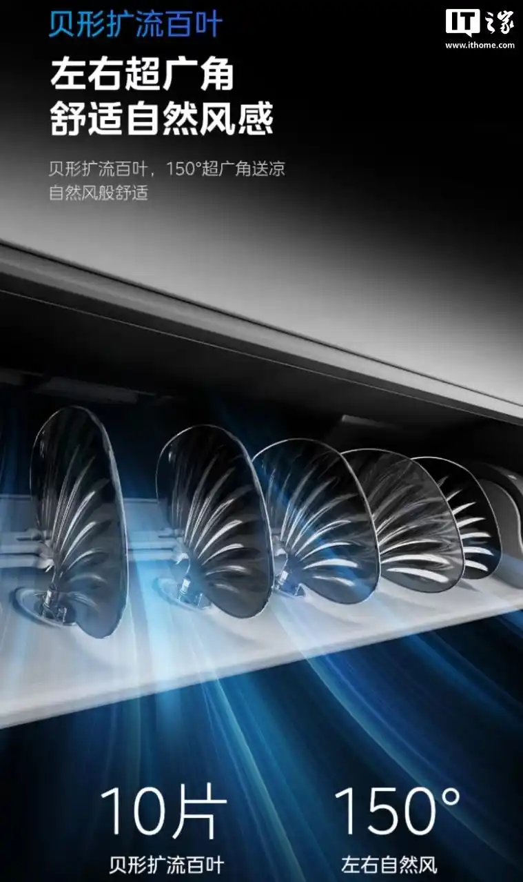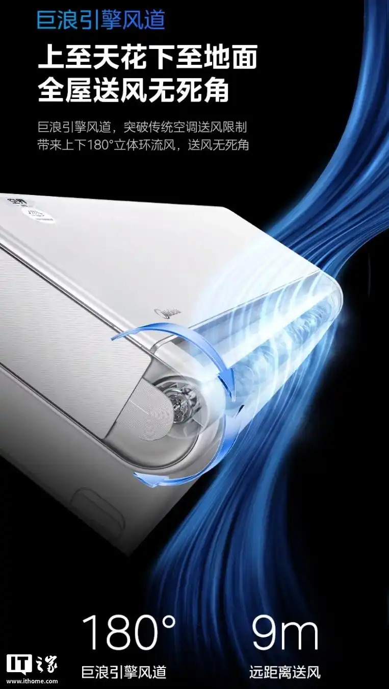 据介绍,美的空界 M5 空调采用巨浪引擎风道,支持 180° 立体环流风、9m 远距离送风;搭配 10 片贝形扩流百叶,支持 150° 左右自然风。该空调支持康达气流,制冷贴顶风,制暖暖足风。