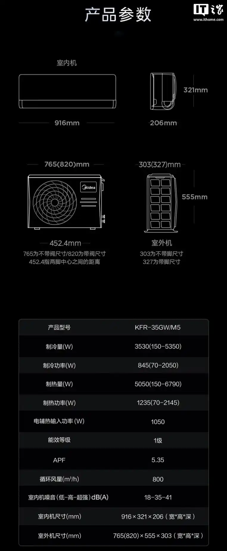 美的空界 M5 空调内机四大核心件升级:蒸发器长度提升 22mm、风道长度提升 73mm、风轮直径提升 7.6mm、铜管长度提升 2010mm,拥有 1 级能效等级,并提供一键酷省电功能,号称“立省 25% 电量”。