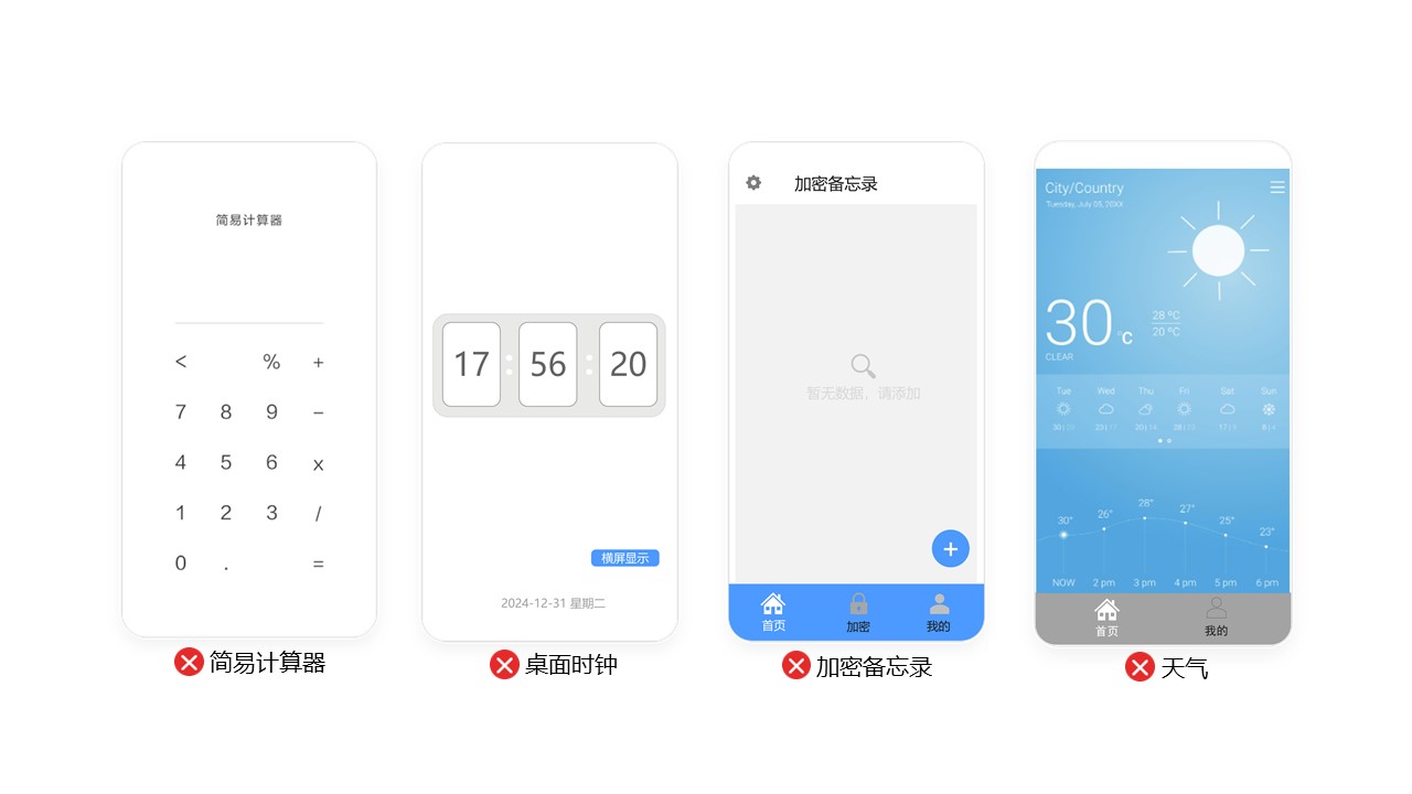 问题1:不收录应用功能与手机系统自带的功能重复,缺乏独特价值。如简易计算器、桌面时钟、加密备忘录、天气、手电筒、指南针、镜子、日历、计时类等。