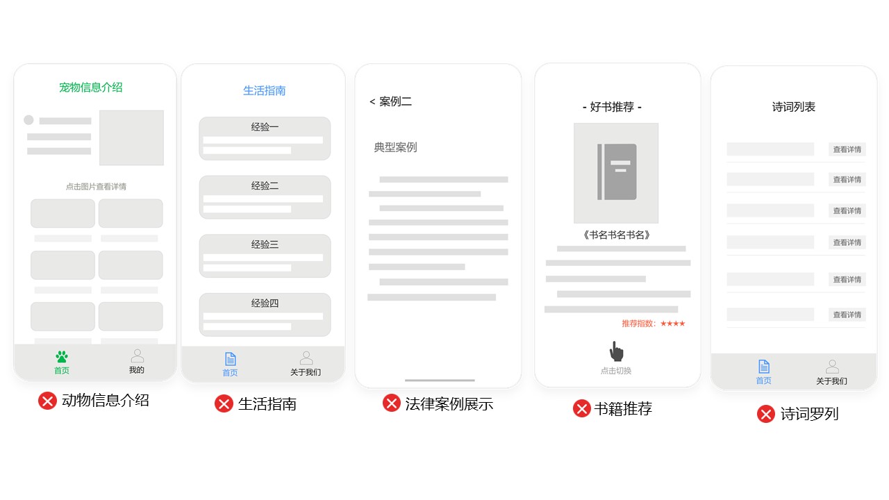 问题2:应用为有限的信息内容罗列不收录,如信息介绍,生活指南、法律案例展示、书籍推荐、诗词罗列等。
