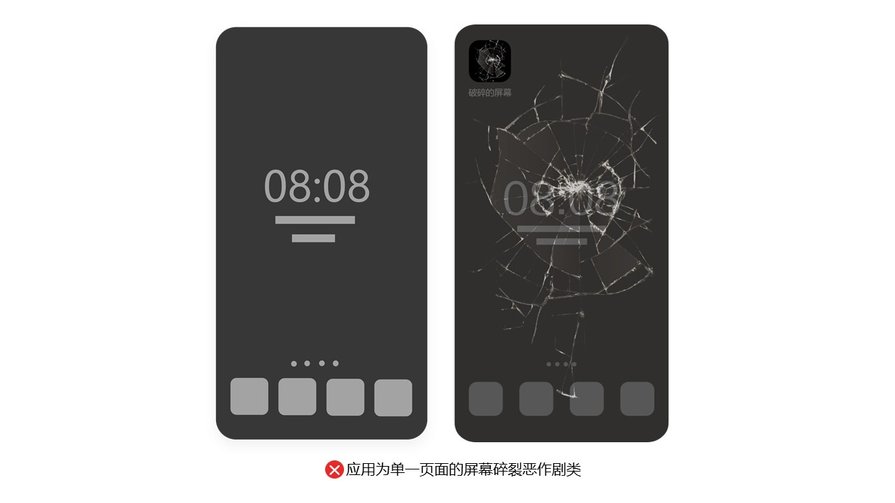 问题3:单一界面的恶作剧恶搞类应用不收录,如屏幕破裂、屏幕鬼魂、模拟打嗝等。