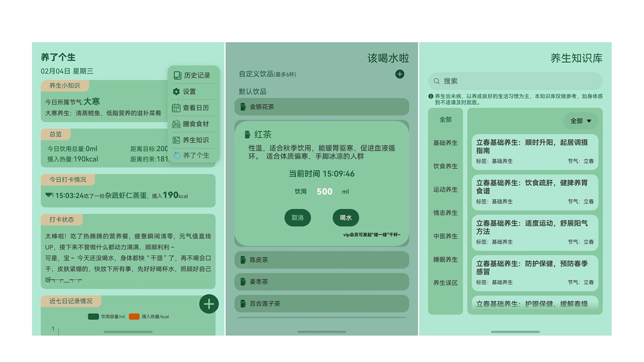 优化后:丰富应用核心功能,优化首页打卡统计展示,及新增“膳食食材、养生知识”等养生内容及“组队打卡、隔空传送”等趣味内容。