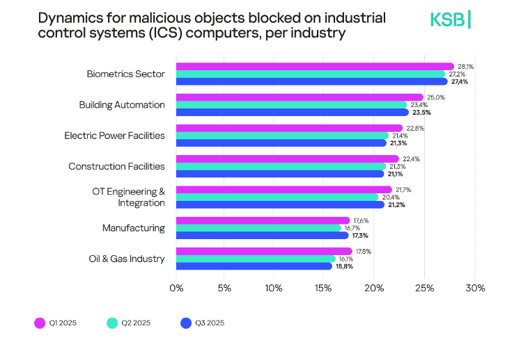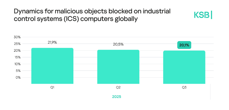 2025 年的特点是工业环境面临持续压力,同时全球威胁态势日益复杂。根据最新的卡巴斯基安全公告报告,遭受恶意软件攻击的工业控制系统(ICS)计算机占比始终居高不下,第一季度约为21.9%,至第三季度仍达20%。