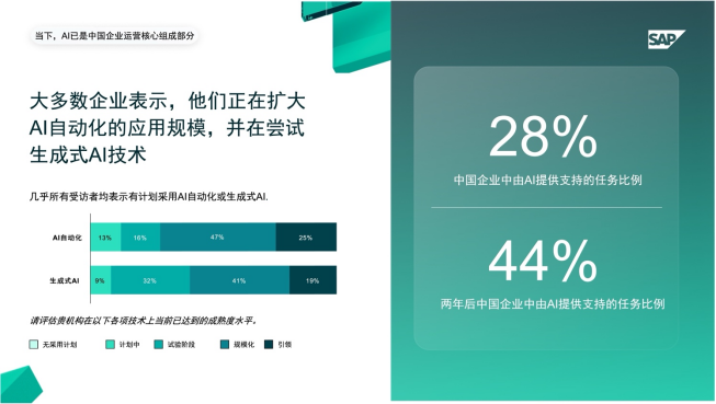如今,人工智能已融入日常业务流程。目前中国企业平均28%的业务任务由AI提供支持,未来两年这一比例预计将升至44%,在8个国家中均居首位。