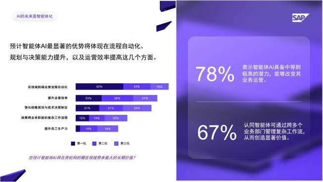 Bown 补充道:“智能体 AI作为能够跨复杂流程进行规划、执行和协作的系统,将成为推动业务转型的下一波浪潮。虽然企业对AI智能体的投资回报率预期已相当乐观,但要真正实现这一价值,仍需依托数据、应用与AI的整合基础。SAP 聚焦客户携手,将这些要素融合在一起,这是我们独特优势所在。“