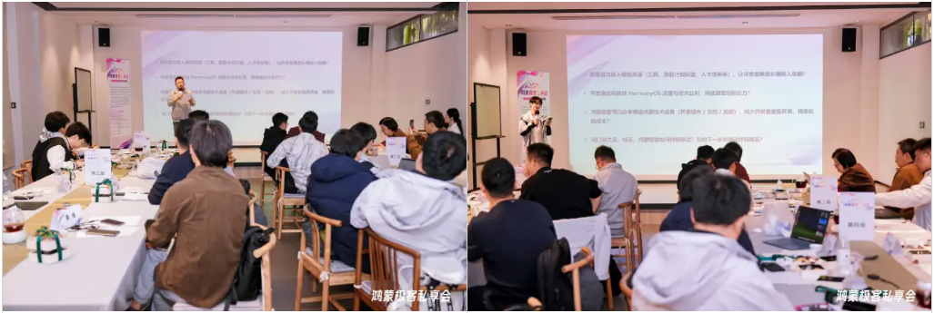 “极客共创·小组研讨”环节成为整场活动的高潮。围绕“鸿蒙极客如何基于鸿蒙生态激发创新”主题展开了头脑风暴。讨论聚焦于四大方向:官方资源支持体系、开发者红利机遇、技术成果共享机制以及社区持续联动模式。
