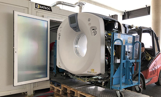 一体式计算机断层扫描设备: 为了帮助进行COVID-19诊断,专门被运往法国巴黎东南部瓦尔德马恩省克雷泰伊Henri-Mondor AP-HP大学医院的快速安装型CT扫描仪。这套系统由GE Healthcare在4月的不到两周时间内开发设计完成——相比之下,传统CT设备光是安装周期就远不止两个礼拜。