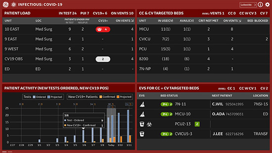 指挥中心视图:新的“版块”在本质上属于一款独立应用,由GE Healthcare利用人工智能算法用于协助医院跟踪COVID-19大爆发引起的一系列变化。