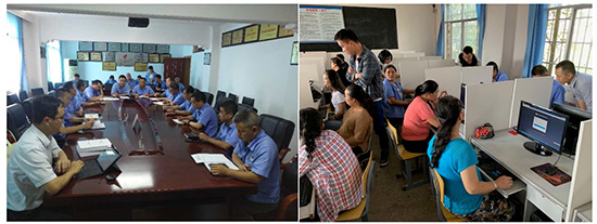 险峰公司职工召开智能制造数字工厂建设项目沟通会(左)、险峰公司职工接受智能制造数字工厂建设培训(右)