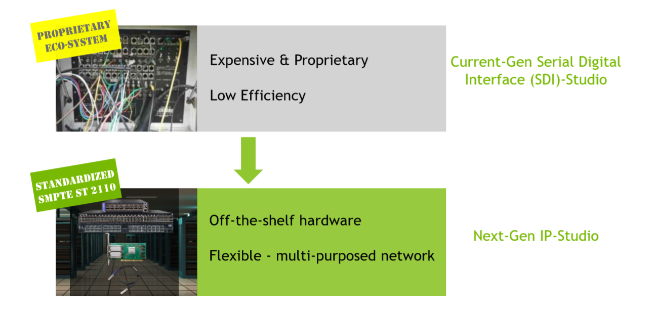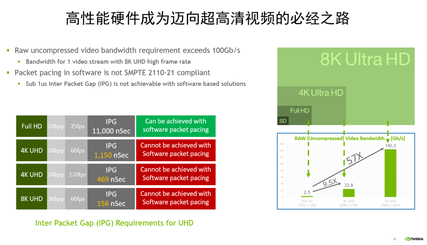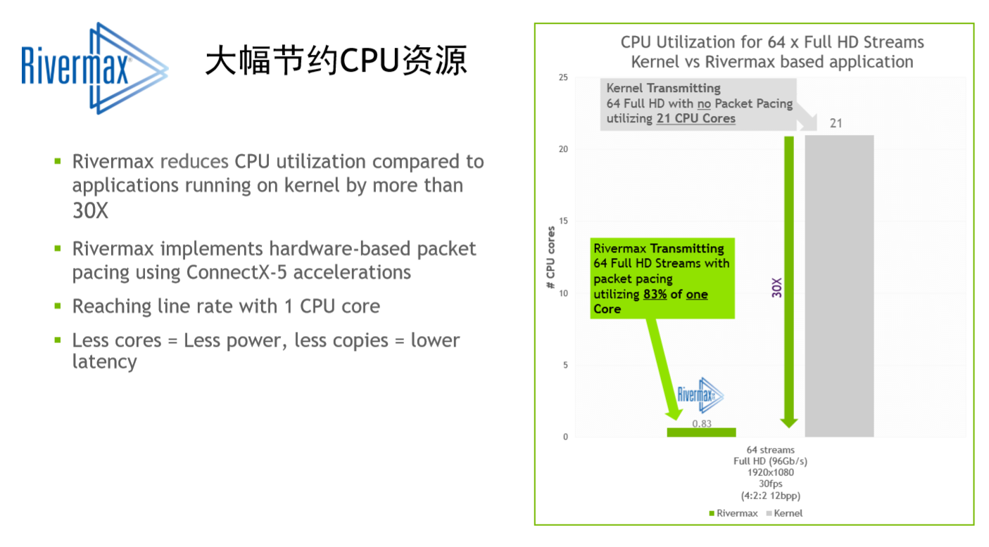 比如不久前NVIDIA达成了与网络设备提供商Mellanox的收购,推了的Rivermax。Rivermax解决方案,让如4K UHD播放从传统的SDI转向IP解决方案,这让新型数据中心的带宽从两位数增长到400G后的各种技术问题。Rivermax中的Packet Pacing特性可以解决码流与SDI设备对接中的实时接收问题,并通过Kernel Bypass使CPU负载大幅下降,最后通过Frames将数据直接整合后通过CPU进行后期处理,将中间的处理过程交由网卡来进行,从而整体上降低服务器的CPU负载。