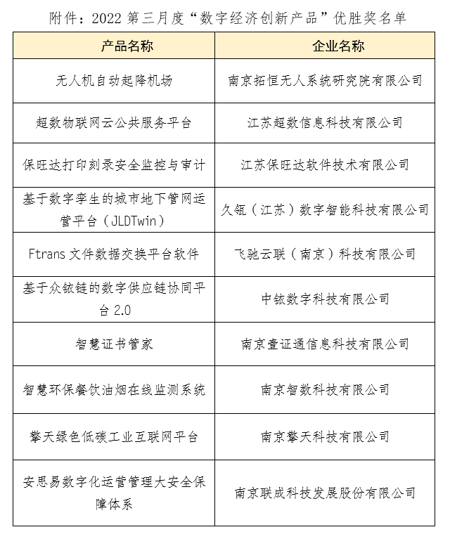 6月29日下午,2022第三月度“星光江苏”数字经济新品发布会作为系列活动的第四场发布会在线上成功举办。经组委会前期征集、线上投票、专家评审综合评分后,评选出无人机自动起降机场、超数物联网云公共服务平台、保旺达打印刻录安全监控与审计、基于数字孪生的城市地下管网运营平台(JLDTwin)、Ftrans文件数据交换平台软件、基于众铱链的数字供应链协同平台2.0、智慧证书管家、智慧环保餐饮油烟在线监测系统、擎天绿色低碳工业互联网平台、安思易数字化运营管理大安全保障体系等10个具有数字技术创新性、模式差异化、市场竞争力的创新产品,并分别在发布会上进行产品路演。
