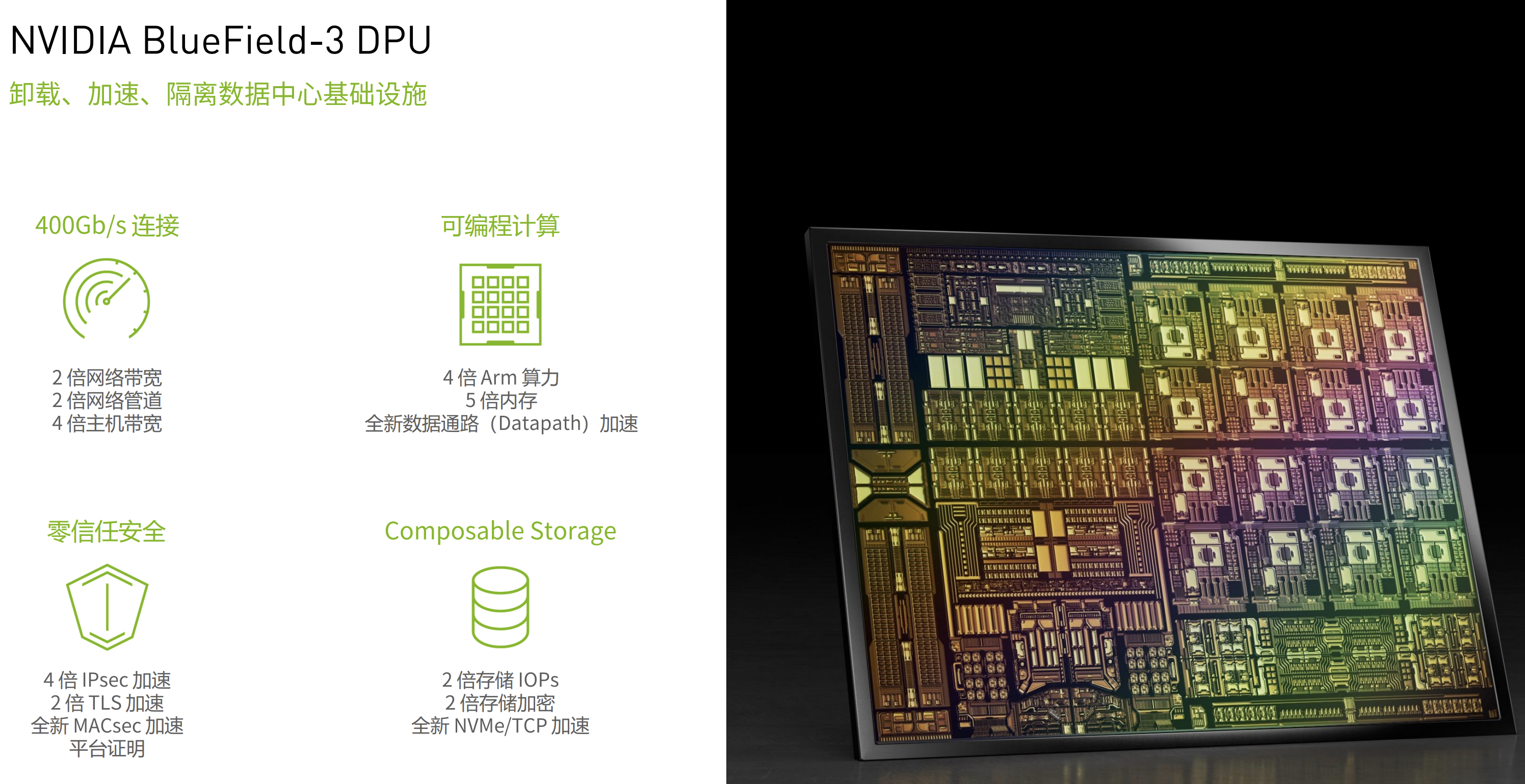 二是NVIDIA BlueField-3 DPU,作为端到端以太网网络平台中重要的组成部分,可以支持客户从云到核心数据中心,再到边缘构建软件定义、硬件加速的IT基础设施。新款BlueField-3 DPU从应用程序负载中卸载、加速和隔离软件定义的网络、存储、安全和管理功能,从而显著提高数据中心的性能、效率,可扩展性和安全性。