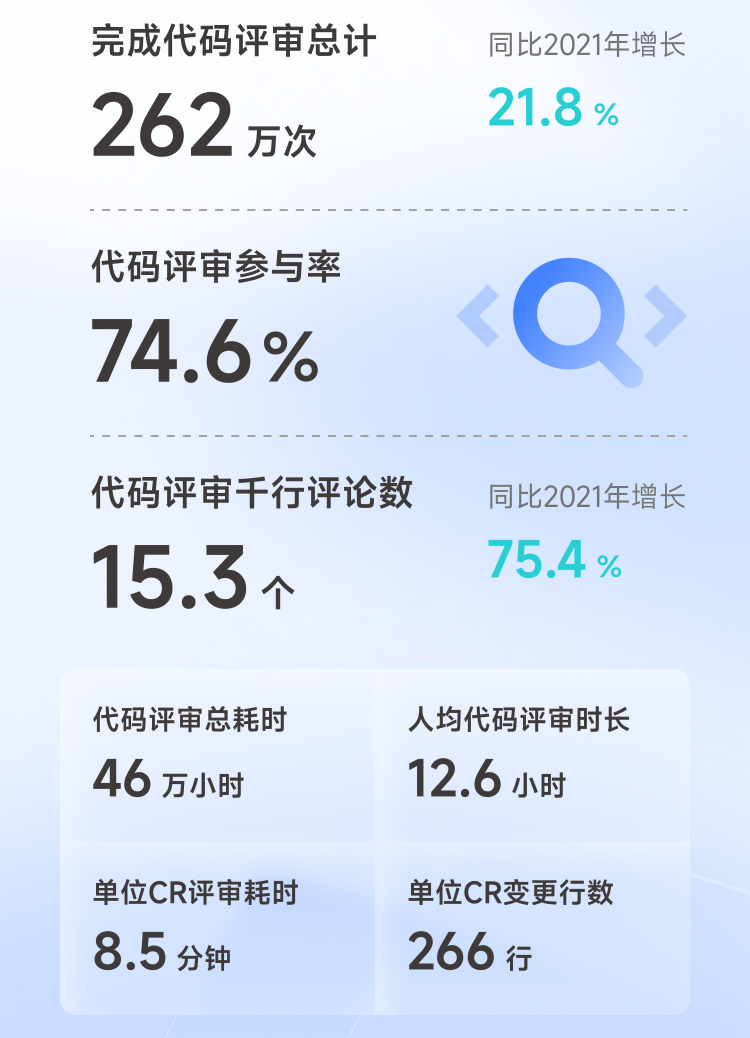 除了研发项目数量,代码质量也是腾讯研发的关注重点。2022年,腾讯总计完成262万次代码评审,相比2021年增长21.8%,代码评审参与率达到74.6%。代码评审总耗时达到46万小时,人均代码评审时长12.6小时,代码评审千行评论数为15.3个,同比增长75.4%。