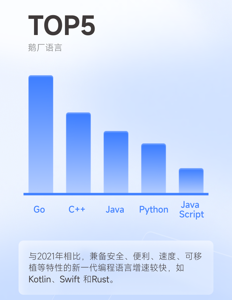 此外,随着云计算等技术的迅速发展,Go语言蝉联腾讯最热门编程语言。值得注意的是,因兼备安全、便利、速度、可移植等特性,Kotlin、Swift和Rust等新一代编程语言的使用增速较快。
