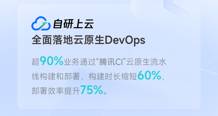 2022年,腾讯宣布自研业务完成全面上云,研发流程全面落地云原生DevOps。《报告》显示,超过90%的业务研发通过腾讯CI云原生流水线构建和部署,构建时长缩短60%,部署效率提升75%。