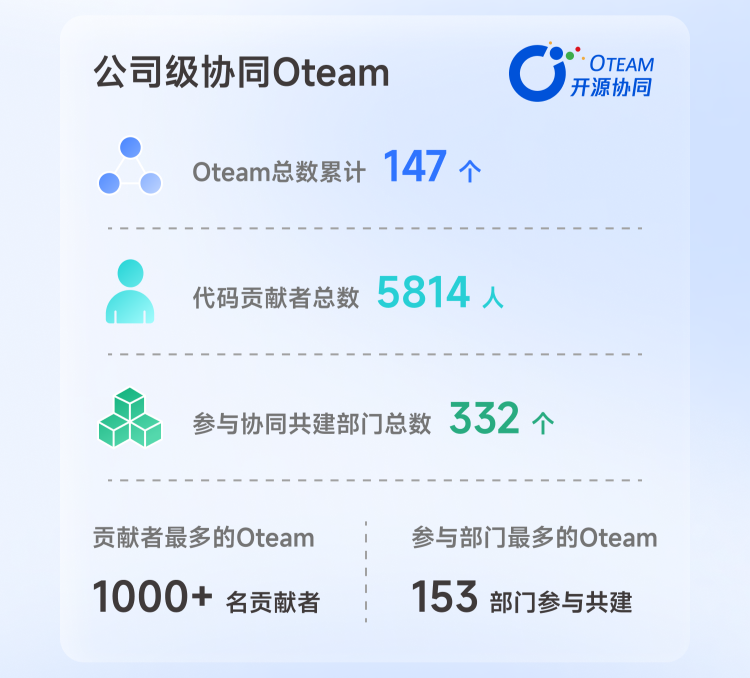 《报告》显示,腾讯内部代码仓库开源率已连续四年保持在80%以上。公司级协同Oteam(开源协同小组简称)总数累计达到147个,涵盖了大数据、数据库、AI、研效、安全等数十个领域。代码贡献者总数达到5814人,参与协同共建的部门总数达到332个。