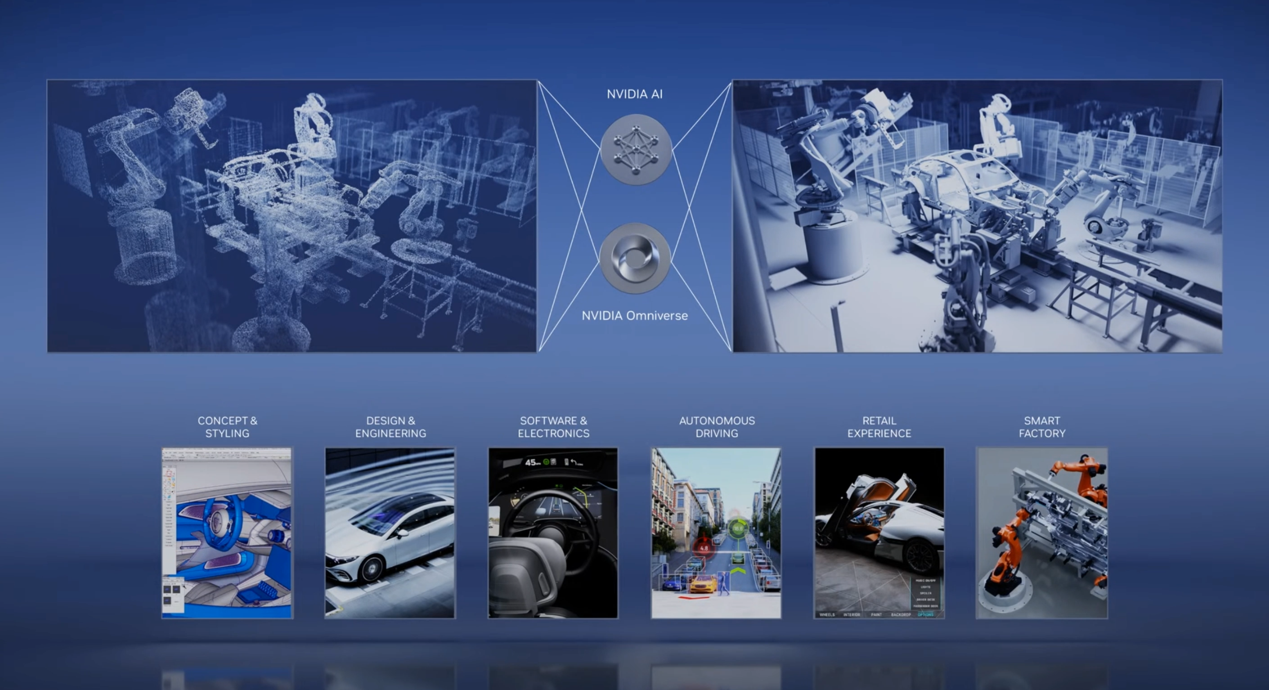 谈到 Omniverse 在整个行业的采用,黄仁勋 说 Lotus 正在使用 Omniverse 来虚拟组装焊接站。梅赛德斯-奔驰使用 Omniverse 来构建、优化和规划新车型的装配线。Rimac 和 Lucid Motors 使用 Omniverse 从忠实地代表他们汽车的实际设计数据构建数字商店。