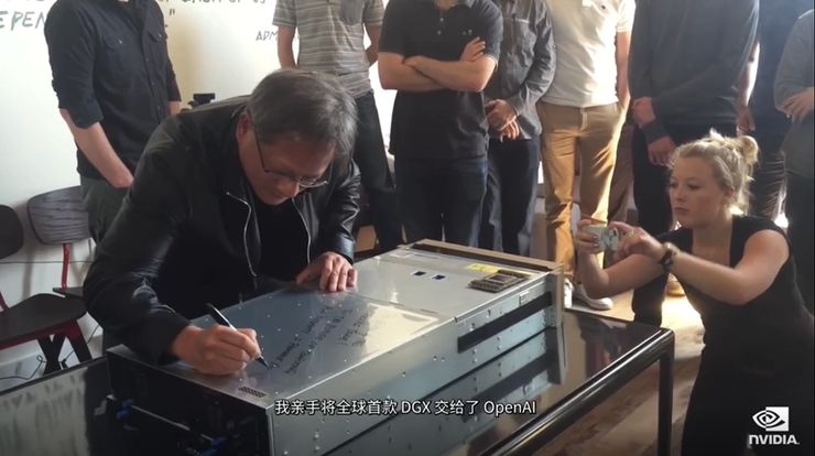 最近爆红的ChatGPT也离不逃脱不开这一定律。正如英伟达CEO黄仁勋在GTC演讲中展示的那样,数年以前,正是黄仁勋亲手将附有自己签名与赠语的全球首台DGX交给了OpenAI。