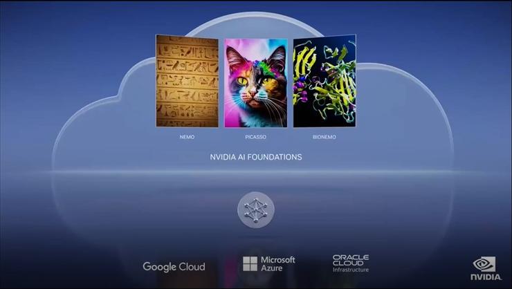 NVIDIA AI Foundations被分为用于构建定制的语言文本模型的Nemo、提供视觉语言制作服务的Picasso和提供医学相关数据专有模型构建服务的Bionemo三个而部分。