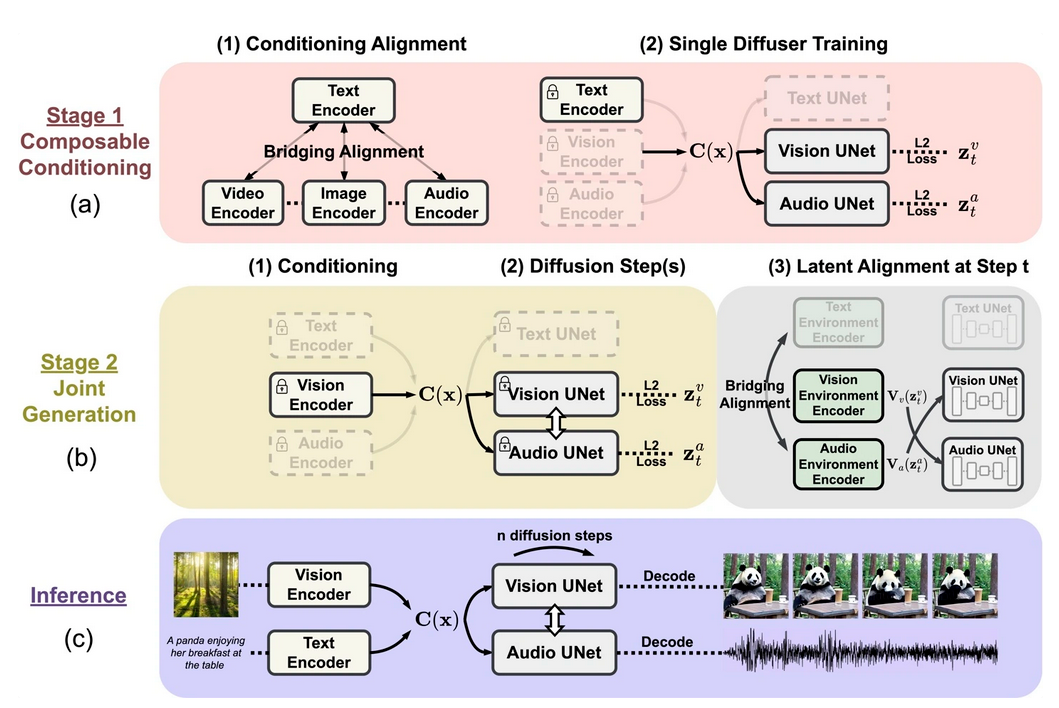 微软设计 CoDi 的目标,旨在解决传统单一模态 AI 模型的局限性。以同步视频和音频为例,独立生成的信息流拼接在一起时可能存在不一致和对齐的问题。