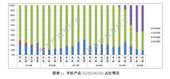 据泰尔终端实验室统计分析,2020年第二季度申请进网的手机产品160款,其中5G手机83款,款型占比51.88,同比增长48.5%个百分点。其中,4G手机63款,款型占比39.38%,与2019年第二季度相比,4G手机款型占比下降40.9个百分点。2G手机款型占比8.75%。