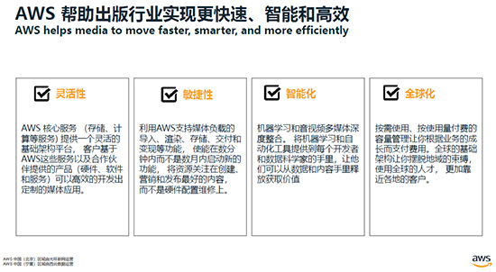 AWS拥有全球的基础架构,可以让出版机构摆脱地域的束缚,使用全球的人才,更加靠近各地的客户。