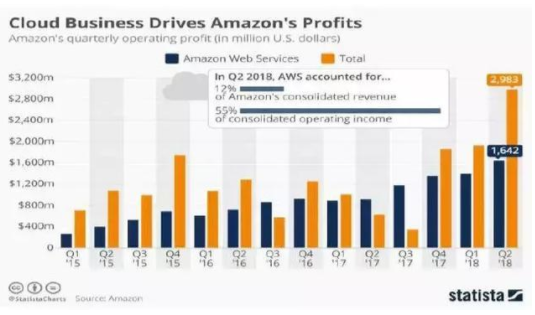 随着云计算市场的高速扩张,云服务不仅对于关于互联网厂商战略意义越发凸显,在财报上也开始贡献亮点。以亚马逊AWS为例,亚马逊前两年就靠AWS的利润反哺其他亏损业务。截止2018年Q2财报,AWS营业利润16.42亿美元,亚马逊29.83亿美元,占比高达55%。其15年第一个交易日股价297美元,依托云计算的高速增长和利润创造,亚马逊股价一度触及2050美元的2018年年内高点,三年多上涨600%。