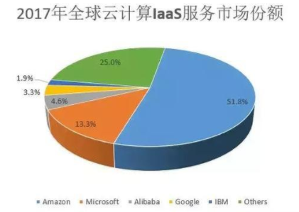 全球云计算市场中,亚马逊AWS一家独大,IaaS服务市场占有率从15年39.8%上升到17年51.8%。微软紧随其后,google,IBM等巨头渐显颓势。