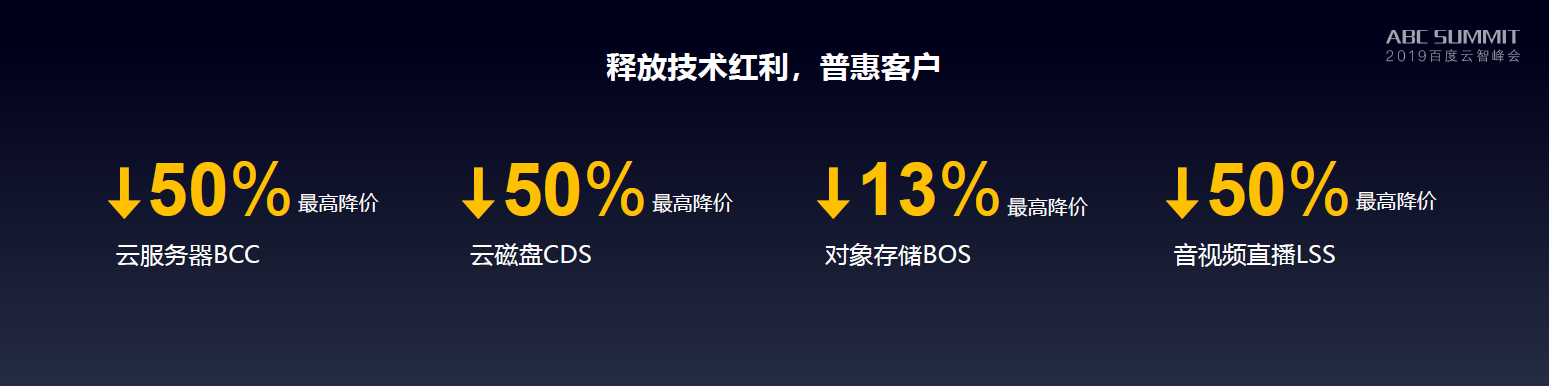 谢广军在现场还宣布,百度智能云将释放技术红利,为企业节省成本,对云服务器BCC、云磁盘CDS、对象存储BOS和音视频直播LSS宣布降价,最大降价幅度达到50%。