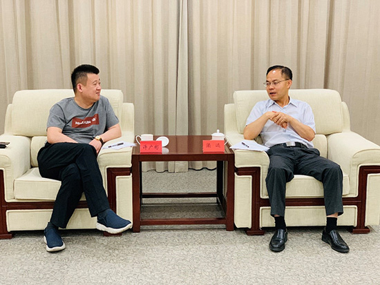 华云数据集团董事长、总裁许广彬与雄安新区党工委委员、管委会副主任梁远交谈