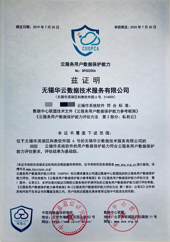 华云数据即将发布的国产通用型云操作系统顺利通过可信云·云服务用户数据保护能力评估
