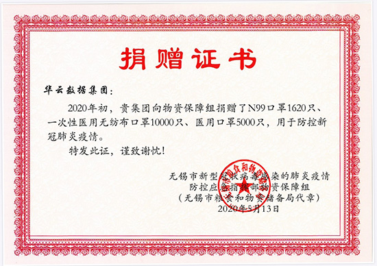 无锡市人民政府表彰华云数据抗疫捐赠 鼓励华云数据再创佳绩、再添新功!