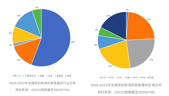 自国家新基建政策出台后,全国地区分布统计分析,华东、华北、华南三个区域的规划新增总机柜数均冲击50万架,北上广深以及周边地区继续领跑全国,其他各省市也出现投资热潮,全国数据中心建设体量猛增。截止2020年7月的数据显示,至2020年底,全国范围内机柜数量超过2000架的数据中心,可以定义为“超大型数据中心”,规划新增单体项目总数约为300个,规划新增机柜总数约为220多万架。