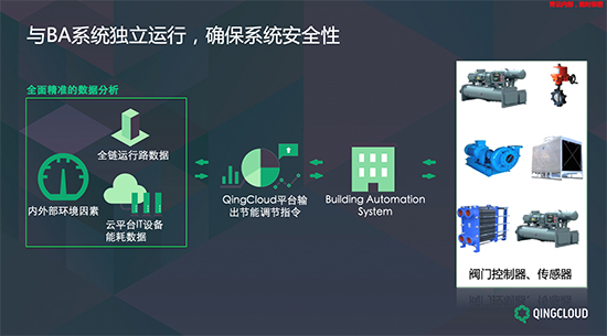 经过多年数据中心运营的经验总结,数据中心制冷链路参数多,每调节完成一次都需要观察期,全部完成至少半天以上,优化效果差;青云QingCloud能效优化技术基于AI算法,准确计算出PUE的准确表达函数因子,推算出最优的控制因子组合,并且所有参数一次性同时设置,1小时内完成;数据中心节能是一个系统工程,更重要的是,关键的物理基础设施作为数据中心的支撑核心,保障信息系统的安全可靠运行是其第一要务,而节能不能以牺牲数据中心的安全性和可靠性为代价。青云QingCloud的系统参数读取及指令下发均通过原有的群控系统进行,不直接读取或控制末端设备;系统与原有群控系统各自独立,停用不影响原有群控系统的运行,真正安全独立的完成任务。