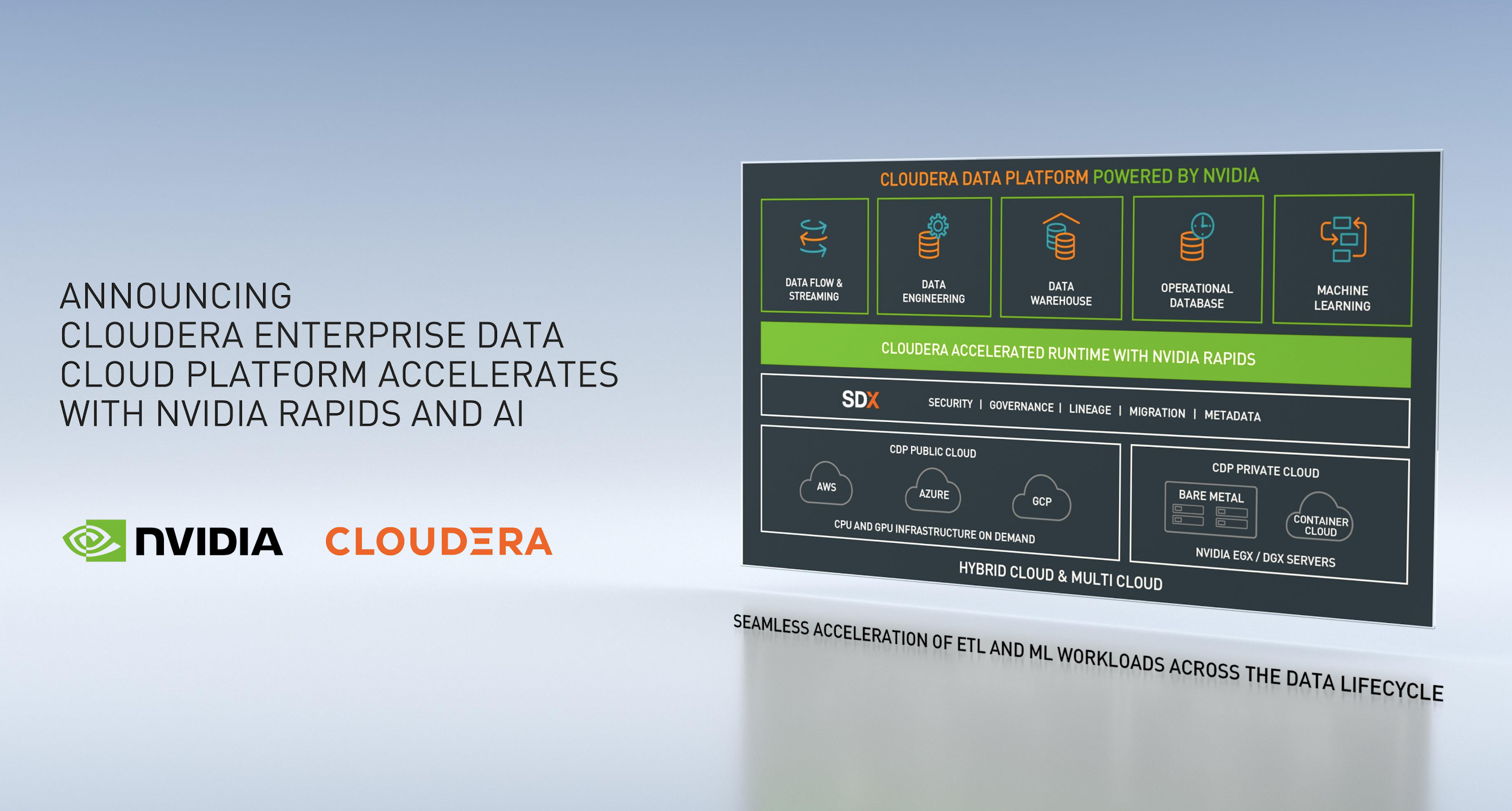Cloudera近日宣布与NVIDIA开展全新合作,借助NVIDIA GPU计算功能,在公共云和私有云帮助Cloudera客户加速数据工程、分析、机器学习和深度学习性能。这一激动人心的合作以共同的愿景为基础,旨在让每家企业实现数据驱动型决策。