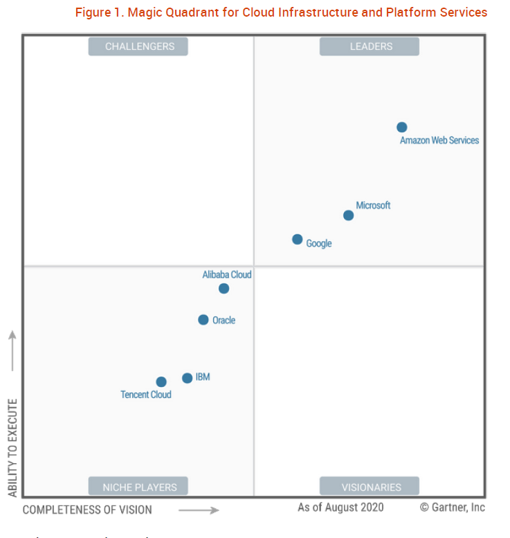 由于具备了上述的优势,AWS云存储服务在Gartner魔力象限连续十年被评为云基础设施服务(IaaS)的领导者,在2020年8月发布的Gartner最新魔力象限Magic Qudrant for Cloud Infrastructure and Platform Services(如下图所示)中继续保持领导者地位。