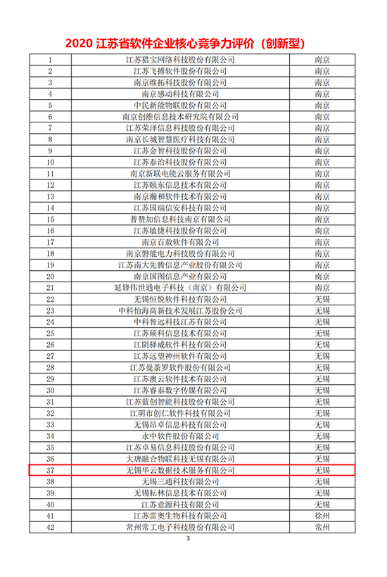 华云数据入选2020江苏省软件企业核心竞争力评价(创新型)企业名单