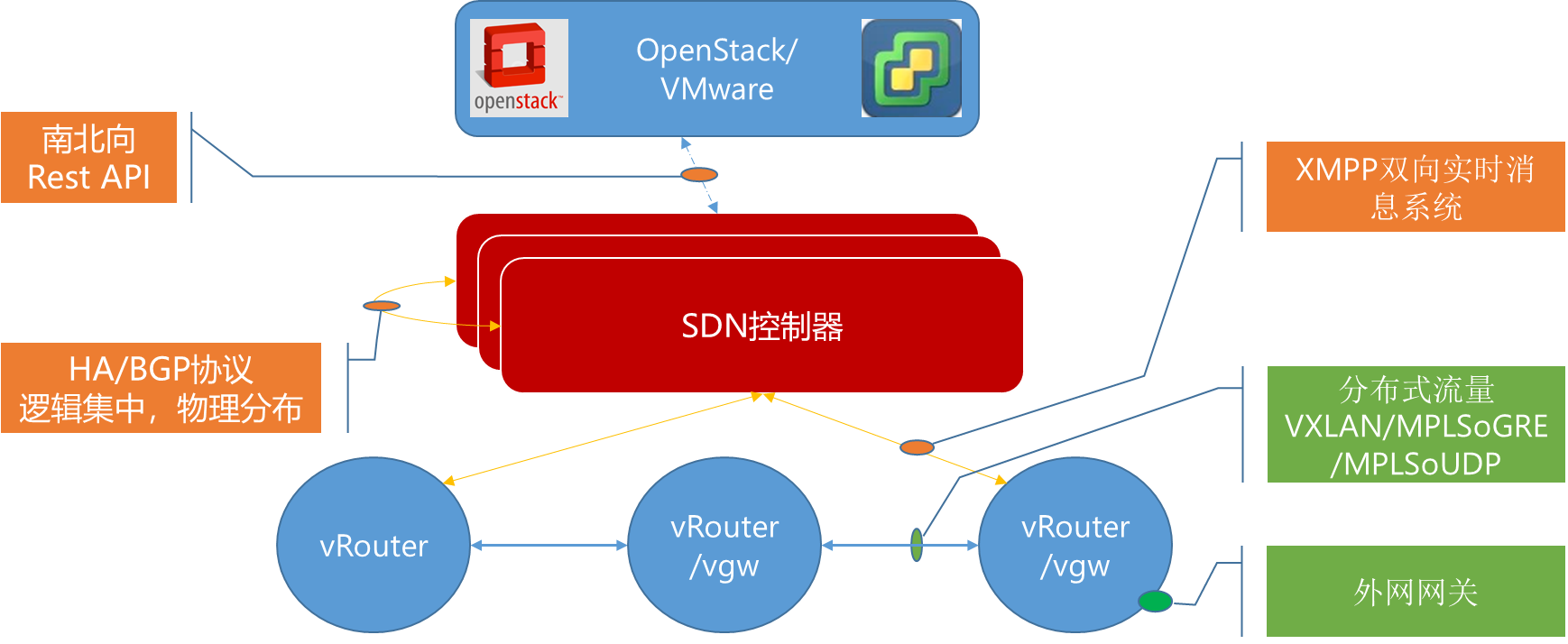 控制面上提供了REST API供不同的云平台进行调用,同时支持了OpenStack和VMware独立集群已经混合集群,以满足用户的不同需求。控制器之间通过BGP协议交互来保证控制器高可用性。