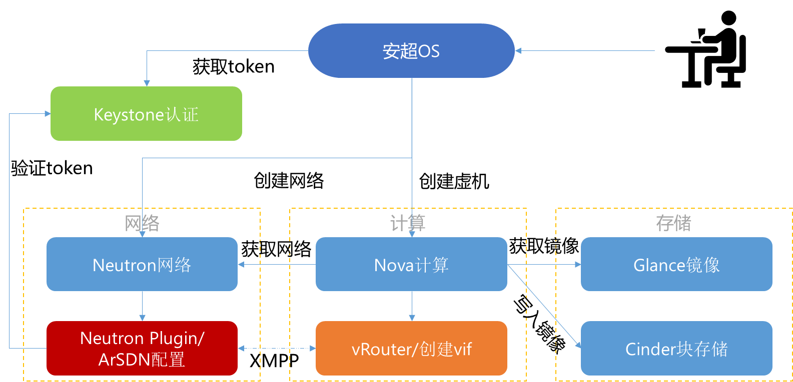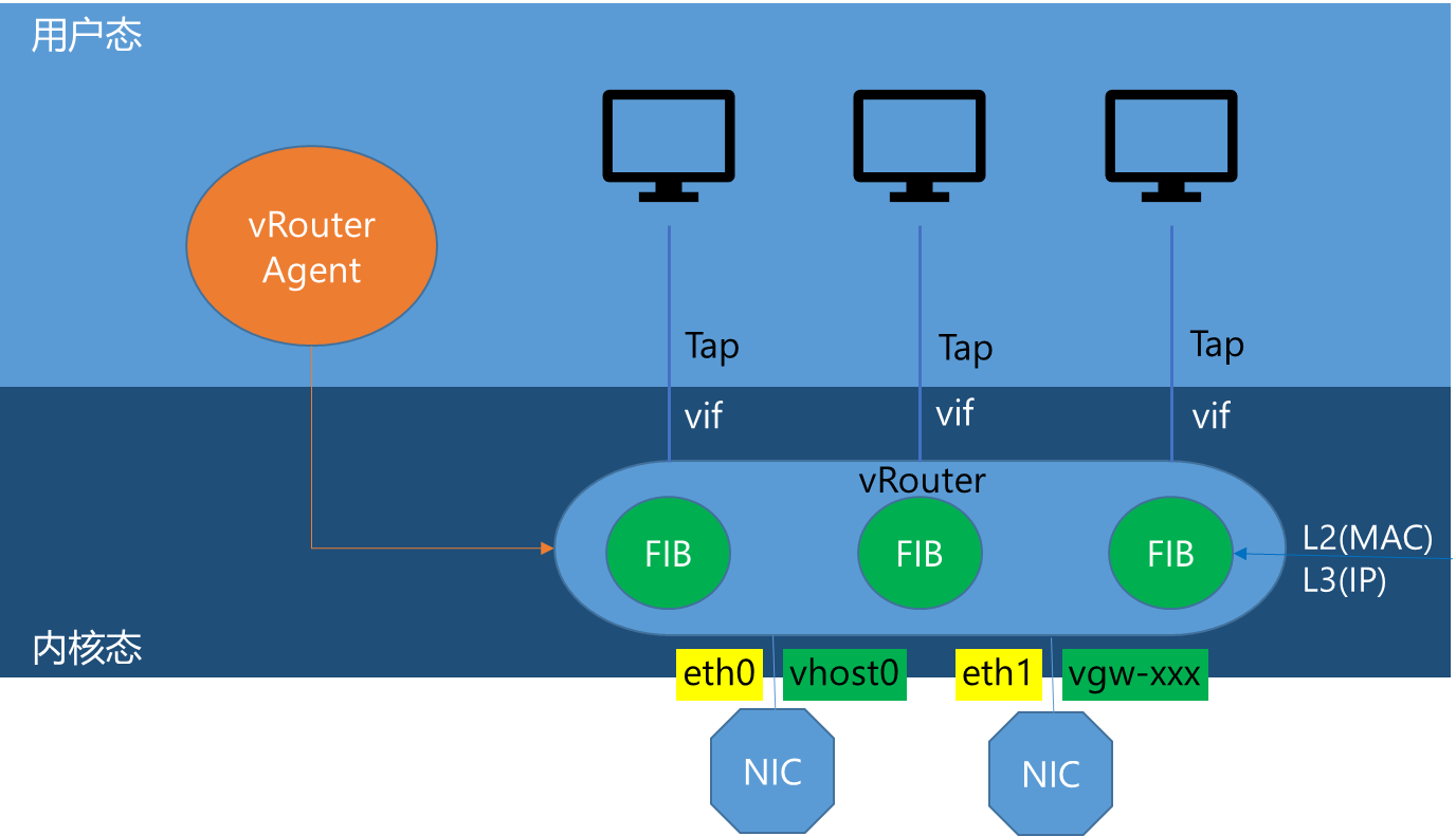 对于OpenStack,通过neutron plugin的方式来对接其相关的网络功能,同时nova在创建接口的时候,会通知vrouter来创建相关的接口,以实现转发面。