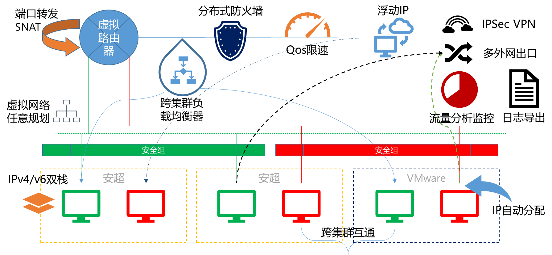 防火墙:采用分布式实现,安全防护在每个节点的vRouter层面执行,只产生极少的CPU开销,并且能够线速执行。不会对物理防火墙设备上造成瓶颈。