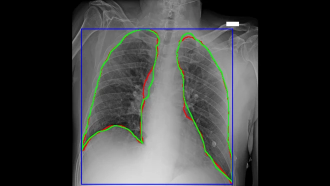 图4 AlforCOVID项目的新冠患者胸部X光片,对感染区域的AI划线(红色)与手工划线(绿色)很接近